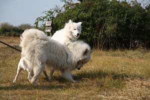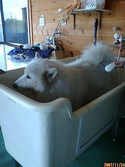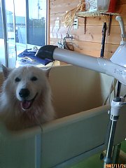 あまりにも汚いひゅうがだったので なんとか徳島にいる間に洗おうと思っていたので 出発前に徳島でセルフシャンプーが出来る所を調べていきました そして、値段、場所で選んだのが メグハウスさん 連休が金~日 だったのに、木、金がお休み しょうがないので土曜日の朝に「今日行きたいんですが・・・」 って電話しました 大型犬500円って書いてあるけど、本当か??って思って 確認したら「何犬?」って「サモエドです」って伝えたら 「申し訳ないけど、サモエドなら1000円でお願いします」って それでも安いからもちろんOK 時間制限も無いんだってv(。-_-。)vブイッ♪ シャンプーとタオルは持参しましたが他はおかりしました 大きなお風呂だし 横が開くから入れるの簡単だし シャワーの水量も結構多め ドライヤーは業務用と家庭のペット用の両方を使わせてもらいました 業務用の水飛ばしもかりましたよ 嫌々でも逃げられないひゅうがは諦めてやられ放題 9月に出した後すっからかんになっていた毛ですが また少し抜け代わりがきていたようで ドライヤーで毛が飛ぶ飛ぶ 洗うのだけでも結構時間かかって たまたまもう一組と少し時間がかぶった様で待たれていたので ドライヤーは外に出してする事にしました 毛が飛ぶ飛ぶですけどね(笑) ひゅうがを一生懸命乾かしてたら 後から洗いだしたシェパードのチビちゃん洗って乾かして 先に終っちゃいました(T▽T)アハハ! 解放されたひゅうがはルンルンで遊んでおりました 私とババはその間お片付け お店の人もスタンプー他数匹の犬を飼ってました その子達の遊び場を改造した割には すごく広いですよ 雨が降った時も遊べます ひゅうがを洗って体の冷えた私とババは カフェでお茶して (´▽`) ホッ 落ち着きました 徳島に来た時には是非ご利用ください 我が家もめっちゃ気に入りましたので 洗いたくなったら徳島に通いたいくらい 交通費払っても損はしないはず お店の人に嫌がられないように出来るだけ利用させていただきます |